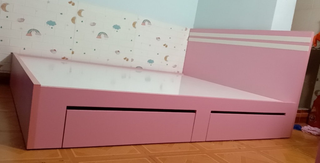 Giường gỗ MDF màu hồng có nhiều kiểu dáng: từ giường đơn đơn giản đến giường hộp có ngăn kéo, giường tầng trẻ em, giường kết hợp tủ đầu giường hoặc kệ sách. Các chi tiết bo góc mềm mại, đường nét uốn lượn nhẹ nhàng kết hợp màu hồng pastel hoặc hồng phấn tạo nên tổng thể hài hòa, dễ thương nhưng không kém phần hiện đại.